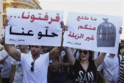 Jouny said the stench from the mounds of trash that blocked Beirut streets was a wake-up call to residents who took pride in their beautiful city. Two major rallies over the weekend brought some 20,000 people into the streets of the capital, numbers rarely seen in a country wary of the chaos in neighboring Syria.