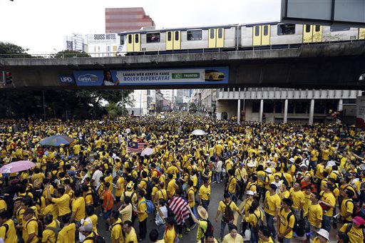 KUALA LUMPUR, Malaysia (AP) — Defying authorities, tens of thousands of Malaysians wearing yellow T-shirts and blowing horns gathered Saturday in Kuala Lumpur for a major rally to demand the resignation of embattled Prime Minister Najib Razak.