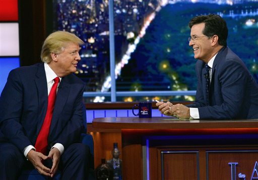 NEW YORK (AP) — Stephen Colbert showered thanks on Donald Trump, his “Late Show” guest.