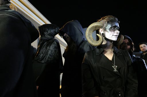 Members of the Satanic Temple of Seattle clad in robes also briefly went to the game, with one woman sporting ram’s horns on her head, to support the teachers and students who invited them.