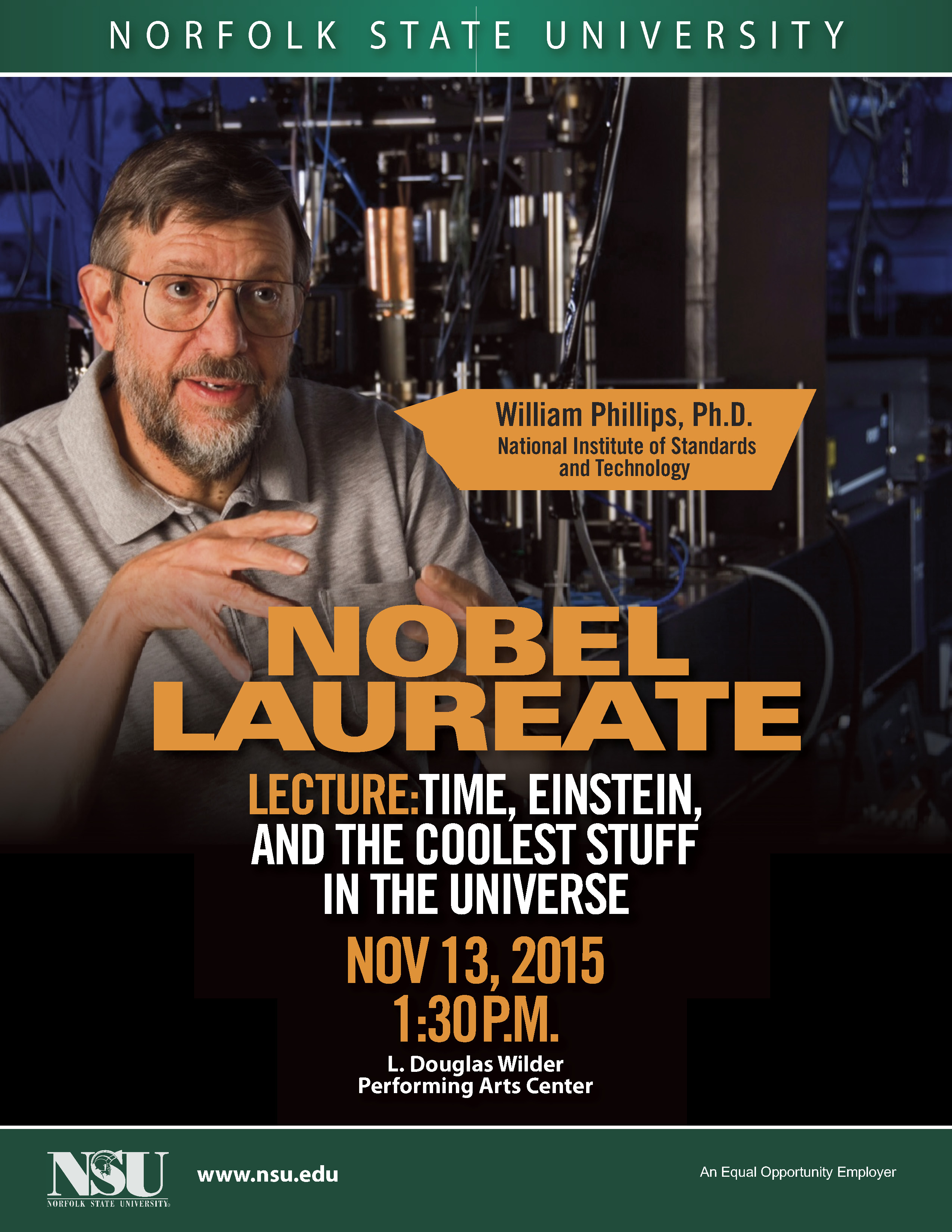 Nobel Laureate William D. Phillips, Ph.D., will discuss how the use of ultra-cold atoms is influencing the accuracy of telling time. His lecture, “Time, Einstein and the Coolest Stuff in the Universe,” is scheduled for 1:30 p.m., November 13, at the L. Douglas Wilder Performing Arts Center, located on the campus of Norfolk State University. It is free and open to the public.