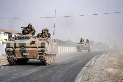 FILE- In this Thursday, Aug. 25, 2016 file photo, Turkish army tanks and armored personnel carriers move toward the Syrian border, in Karkamis, Turkey. Last month, Turkey for the first time sent tanks across the border into Syria to help rebels clear territory of IS militants and to contain the