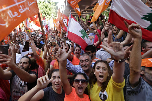 Supporters of Christian leader Michel Aoun, holding Free Patriotic Movement and Lebanese flags, celebrate the election of the new President Michel Aoun, in Beirut, Lebanon, Monday, Oct. 31, 2016. Lebanon’s parliament on Monday elected Michel Aoun, an 81-year-old former army commander and strong ally of the militant group Hezbollah, as the country’s president, ending a more than two-year vacuum in the top post and a political crisis that brought state institutions perilously close to collapse. (AP Photo/Hassan Ammar)