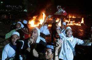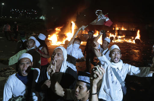 Muslim protesters chant slogans near burning police trucks during a clash with the police outside the presidential palace in Jakarta, Indonesia, Friday, Nov. 4, 2016. Police in the Indonesian capital clashed with hard-line Muslim protesters refusing to disperse after a massive protest Friday to demand the arrest of the city’s minority-Christian governor for alleged blasphemy. (AP Photo/Dita Alangkara)