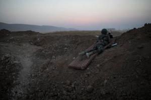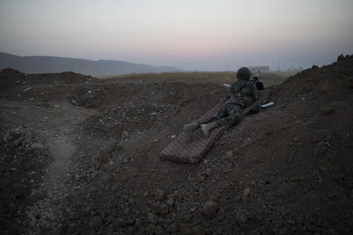 A Kurdish Peshmerga soldier overlooks Islamic State positions in Bashiqa, east of Mosul, Iraq, Monday, Nov. 7, 2016. Iraqi Kurdish fighters are exchanging heavy fighters with militants as they advance from two directions on a town held by the Islamic State group east of the city of Mosul. (AP Photo/Felipe Dana)