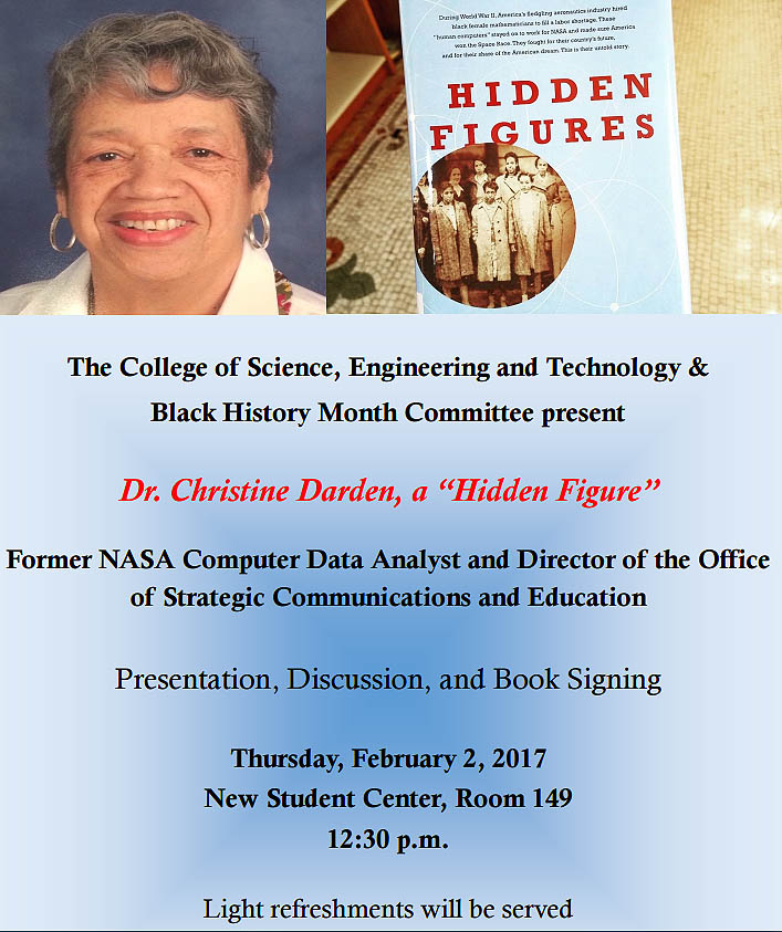 Dr. Christine Darden, one of NASA’s “Hidden Figures” as highlighted in the recent movie, will speak in the Student Center, room 149, on Thursday, Feb. 2, at 12:30 p.m. The presentation, discussion and book signing is sponsored by the College of Science, Engineering and Technology and the Norfolk State University Black History Month Committee.