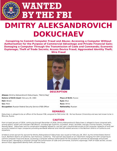 Dokuchaev, a 33-year-old major in the FSB’s Information Security Center, was arrested in December as part of a treason case, Russian media have reported. The U.S. Justice Department would not confirm that account.