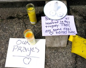 Customers on Monday placed balloons as tribute in front of the store, lit candles near its parking lot and signed a large get-well poster for the worker.