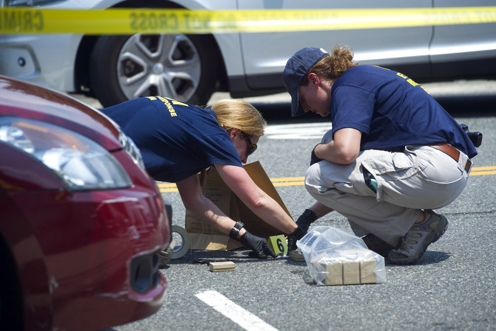 “He was just very calm. He was just walking and shooting,” she said of the man, whom she described as white and wearing a T-shirt and shorts. She said he was using a long gun and exchanging fire with law enforcement officers, one of whom yelled for her to get down.