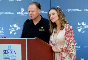 The aerialist spent about eight minutes of the 10-minute stunt hovering over the falls after the helicopter took off from the parking lot roof of the nearby Seneca Niagara casino.