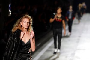 Don’t expect Plein to be politically correct. Models walked down the runway puffing what looked like real cigarettes, with familiar box shape rolled up in T-shirt short sleeves James Dean-style.