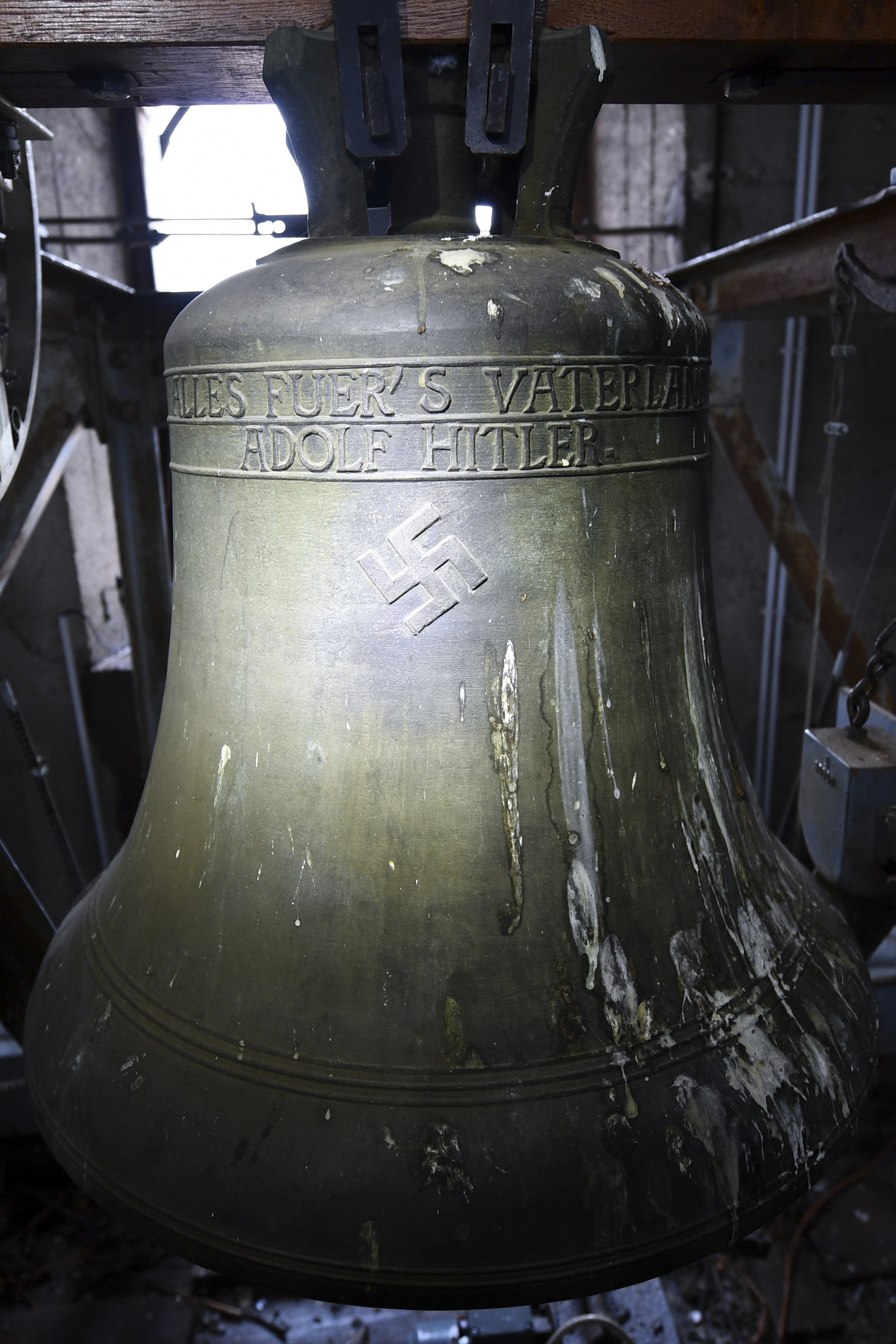 FILE – In this May 19, 2017 file photo a bell a church bell with the inscription “Everything for the fatherland Adolf Hitler” and a swastika is pictured in the town church in Herxheim am Berg, western Germany. The small-town mayor in Germany is resigning following a spat over comments he made suggesting that the Nazi period wasn’t all bad. Mayor Roland Becker said in a statement Wednesday, Sept. 6, 2017, that he considered himself the victim in a spat over a so-called ‘Hitler bell’ hanging in the town church. (Uwe Anspach/dpa via AP, file)