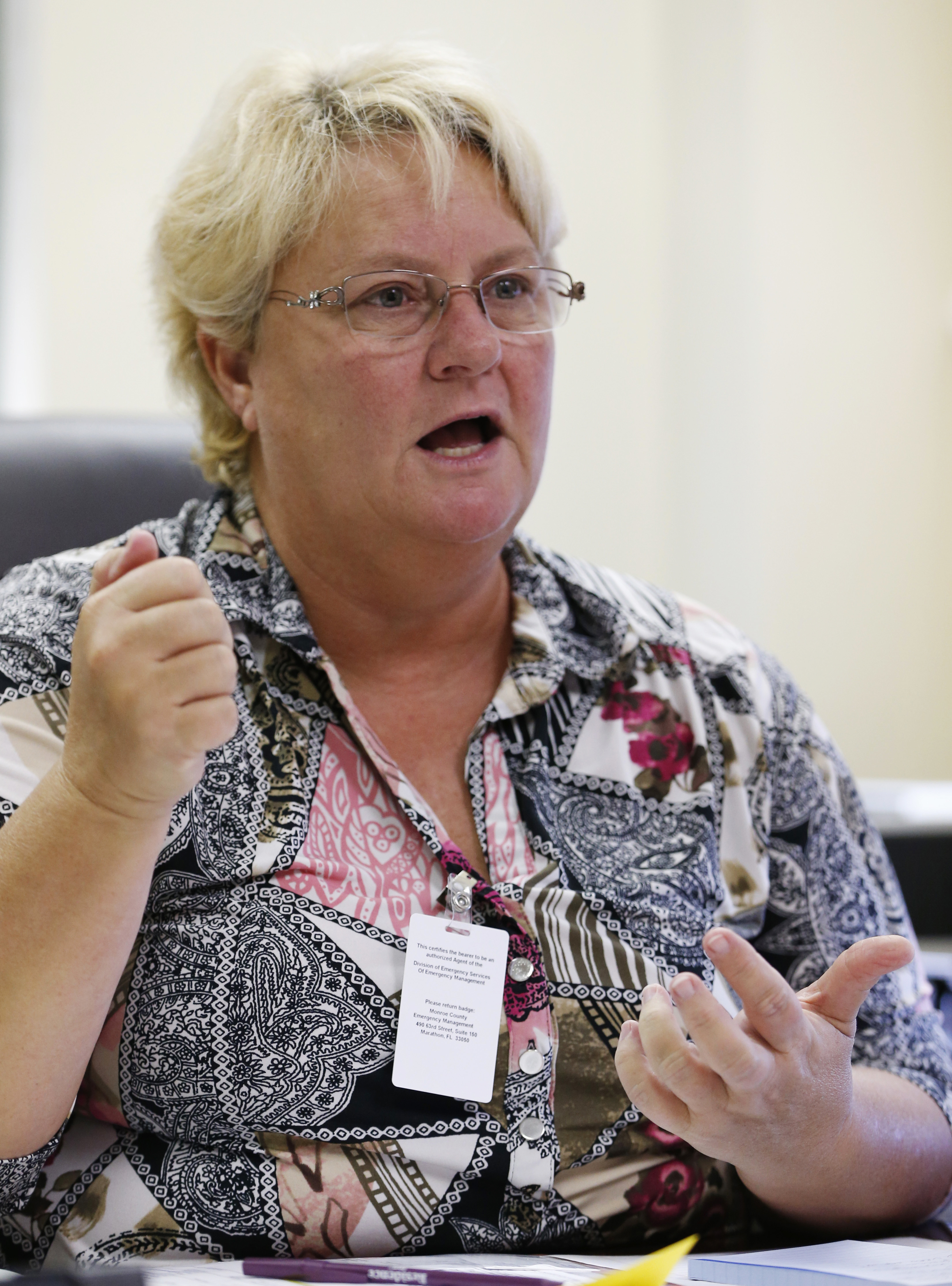 In this Thursday, Sept. 21, 2017, photo, Christine Hurley, assistant county administrator for Monroe County, speaks during an interview, in Marathon, Fla. Out of 7,500 mobile homes in the county outside Key West, nearly all need replacing now, Hurley said. The county has asked the Federal Emergency Management Agency for 7,500 temporary mobile homes, as well as 1,700 travel trailers to park outside individual homes being repaired or rebuilt. (AP Photo/Wilfredo Lee)