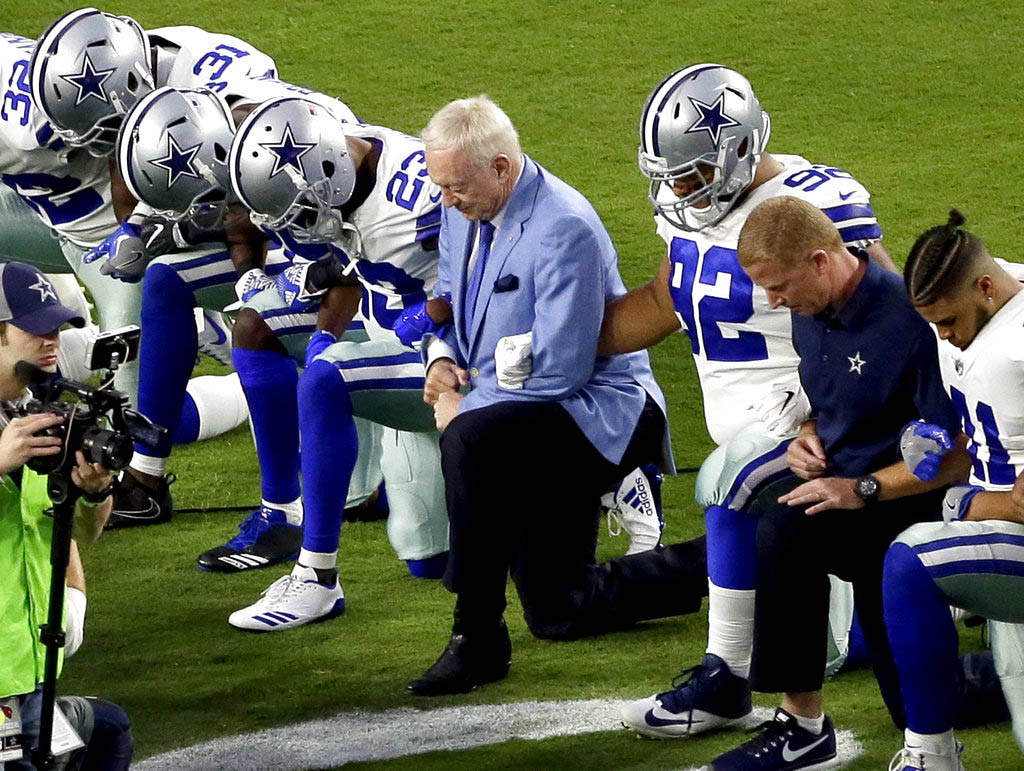 When Colin Kaepernick started this a year ago, a few paid attention and few followed his lead, but now players are rallying together to show their support for the cause in their own ways. Some teams, such as the Cowboys, are opting to stand as a team with their arms linked together in unity instead of kneeling and some players are still kneeling.