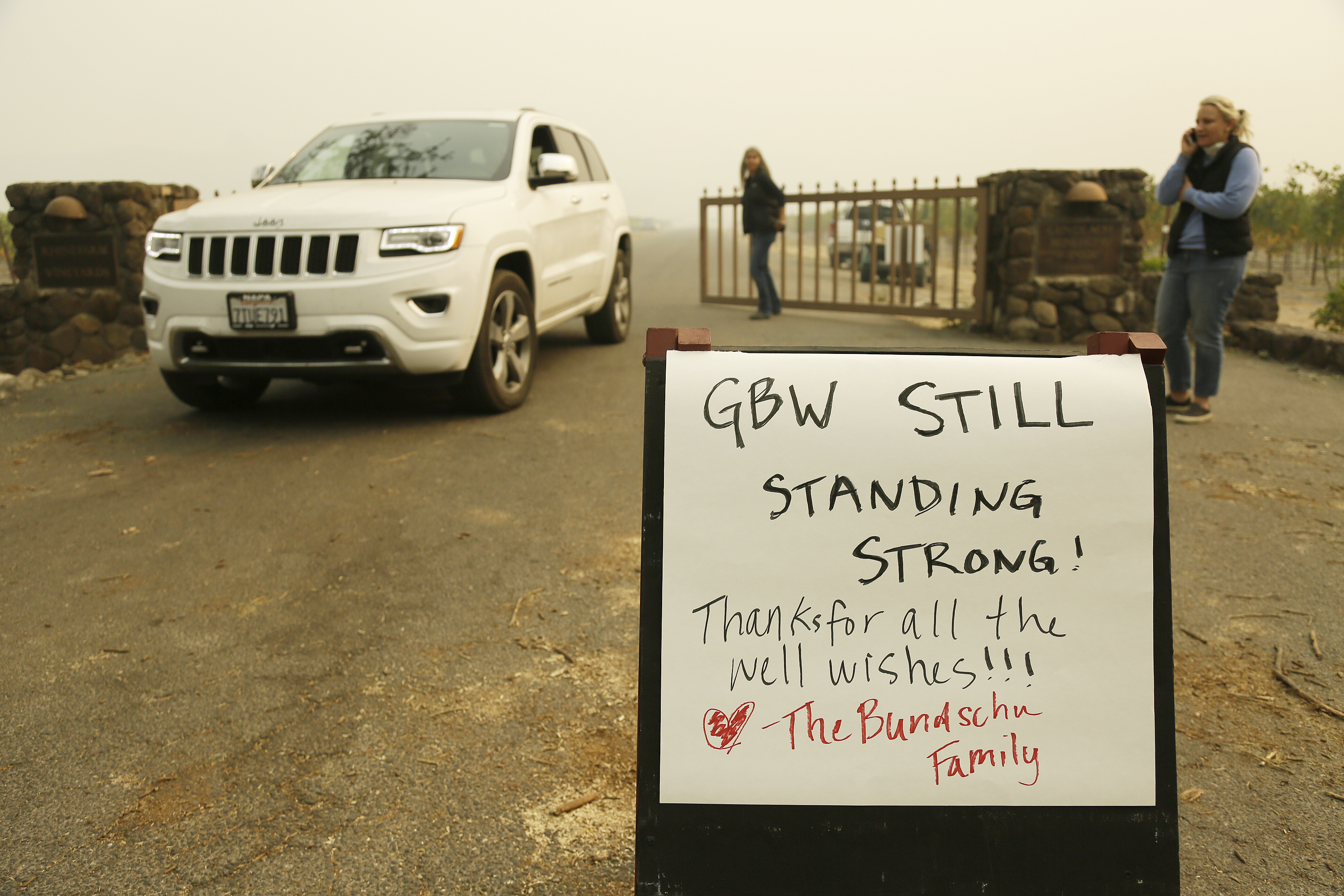 A sign tells people that the historic Gundlach Bundschu winery is still standing, Tuesday, Oct. 10, 2017, in this view near Sonoma, Calif. Workers in Northern California’s renowned wine country picked through charred debris and weighed what to do with pricey grapes after wildfires swept through lush vineyards and destroyed at least two wineries and…