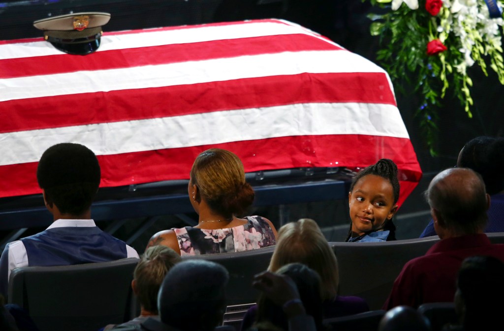 Hundreds of police officers and military service members filled the Henderson, Nevada, church where bagpipes played and pallbearers bore Hartfield’s flag-draped casket into the auditorium. Speakers stepped to a podium flanked by a two pair of western boots. One, a worn brown pair, was stitched with the American flag.