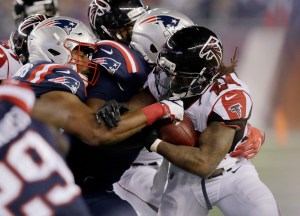 New England scored the final 31 points to win the NFL championship in February. Placards and shirts reading 28-3 were ever-present in and around Gillette Stadium as the Patriots (5-2) scored the first 23 points in this prime-time mismatch. The Falcons (3-3) were outplayed throughout this one.