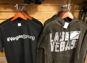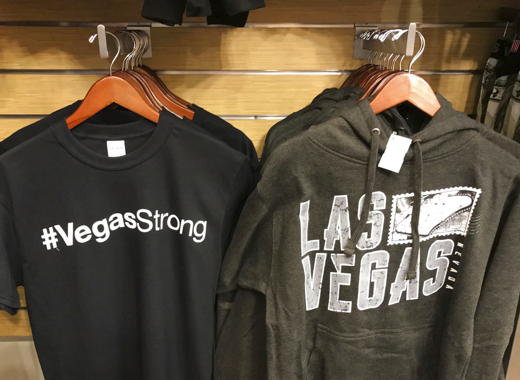 Retailers jumped in, selling #VegasStrong T-shirts for $18.75 in airport gift shops. Proceeds from the shirts will go to an official fund to benefit victims, a shop salesman said.