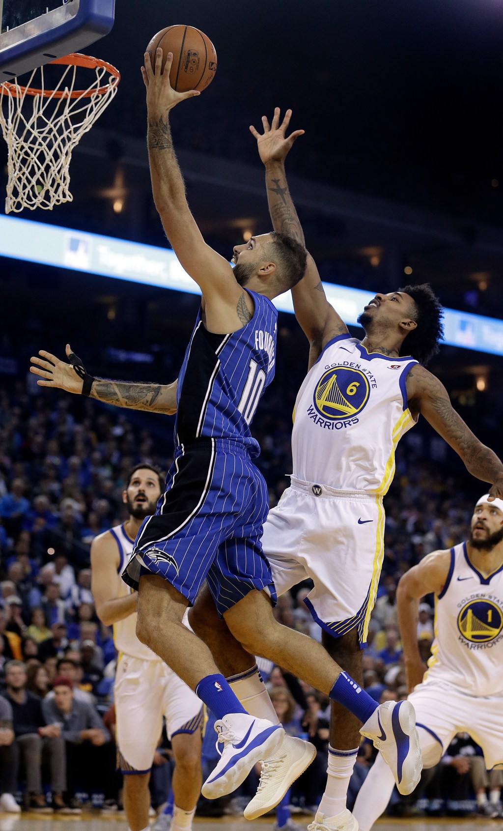 Magic: F Jonathan Isaac was sidelined by a sprained right ankle that he injured in the fourth quarter Saturday night in Denver, where he left the arena in a walking boot. … Elfrid Payton returned to the lineup after sitting out Saturday as a precaution given his previous left hamstring trouble, while G D.J. Augustin missed his fifth straight game Monday with a strained left hamstring. “We can’t worry about who’s not in uniform,” Vogel said. … Former Warrior Marreese Speights drew cheers when he checked into the game at the start of the second.