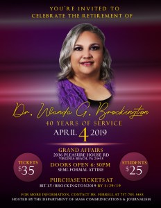 Norfolk State is left with a bittersweet feeling after Dr. Wanda Brockington announces her retirement celebration after 40 years of service to Norfolk State University. The celebration will take place at 2036 Pleasure House Road in Virginia Beach, Virginia on April 4th. Doors open at 6:30 p.m. and the dress code is semi-formal attire.