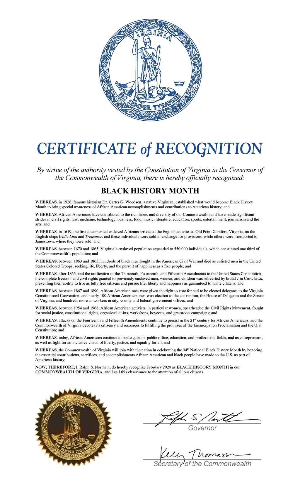 Governor Northam today issued a proclamation to commemorate February as Black History Month in the Commonwealth. The theme of 2020’s national Black History Month is “African Americans and the Vote.” This year marks the 150th anniversary of the Fourteenth Amendment, which gave black men the right to vote, and the 100th anniversary of the Nineteenth Amendment, which gave women the right to vote.