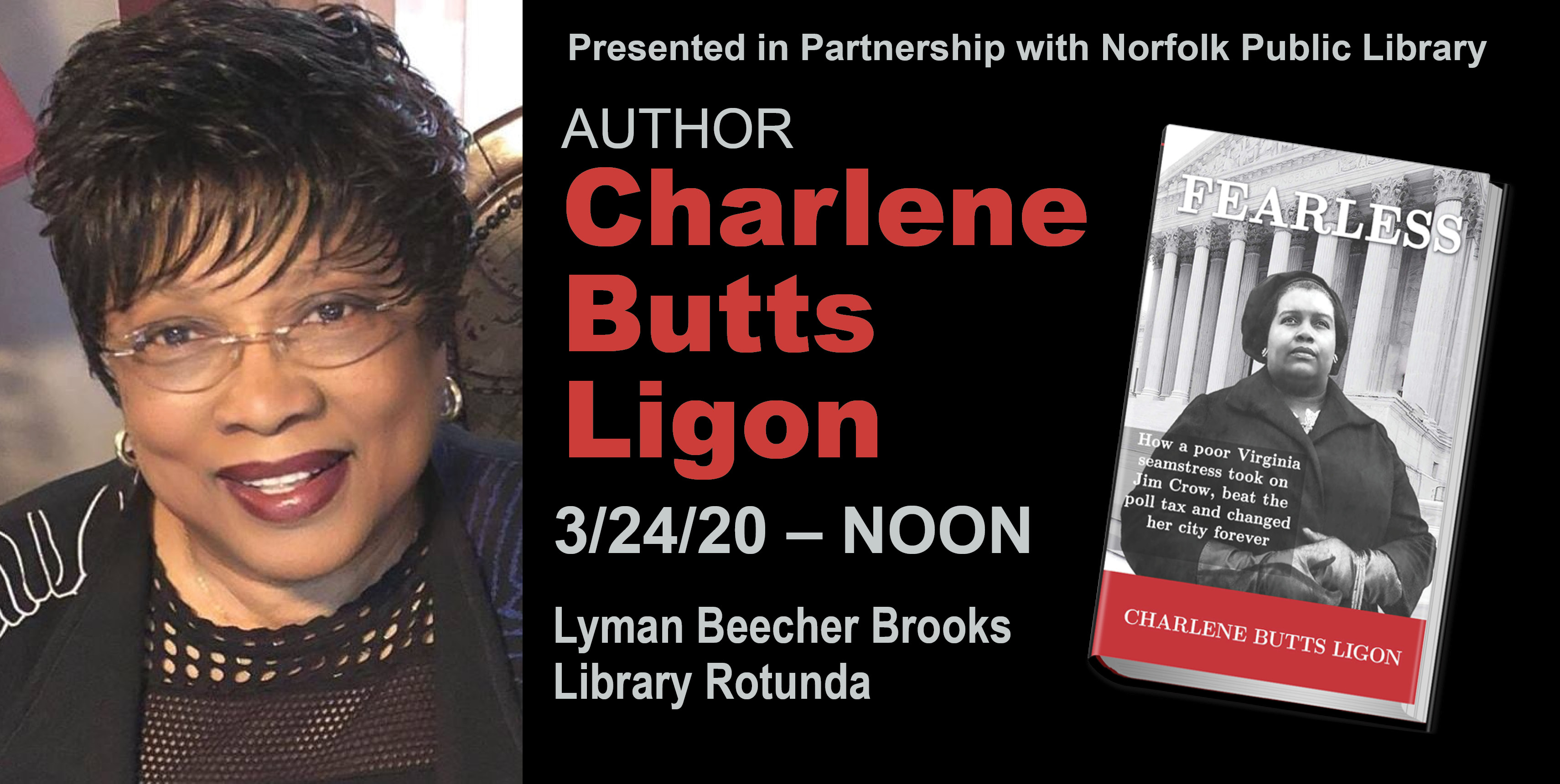 NORFOLK, VA – In partnership with Norfolk State University, the Norfolk Public Library is honored to host Charlene Butts Ligon for Women’s History Month on Tuesday, March 24, at noon in the Lyman Beecher Brooks Library Rotunda. Ligon will discuss the book she wrote about her late mother, Evelyn Thomas Butts of Norfolk, FEARLESS: How a poor Virginia seamstress took on Jim Crow, beat the poll tax and changed her city forever.