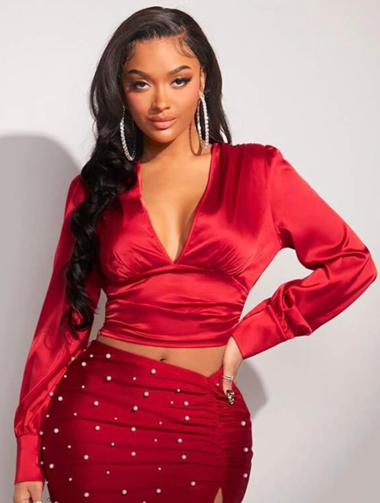 Want to channel your inner baddie with a fierce purple outfit? Try a nice top like this surplice neck satin blouse. You can pair this look with flowy pants and sandals for a nice casual daytime look, or with killer heels and a smoky eye makeup look for more of a sultry nighttime look.