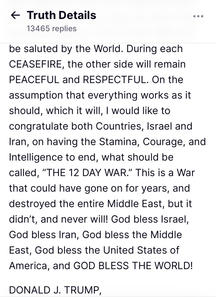 “Officially, Iran will begin the CEASEFIRE at the 12th hour. Israel will follow shortly after. Upon the 24th hour, an Official End to the 12-DAY WAR will be saluted by the World,” Trump wrote in a post.